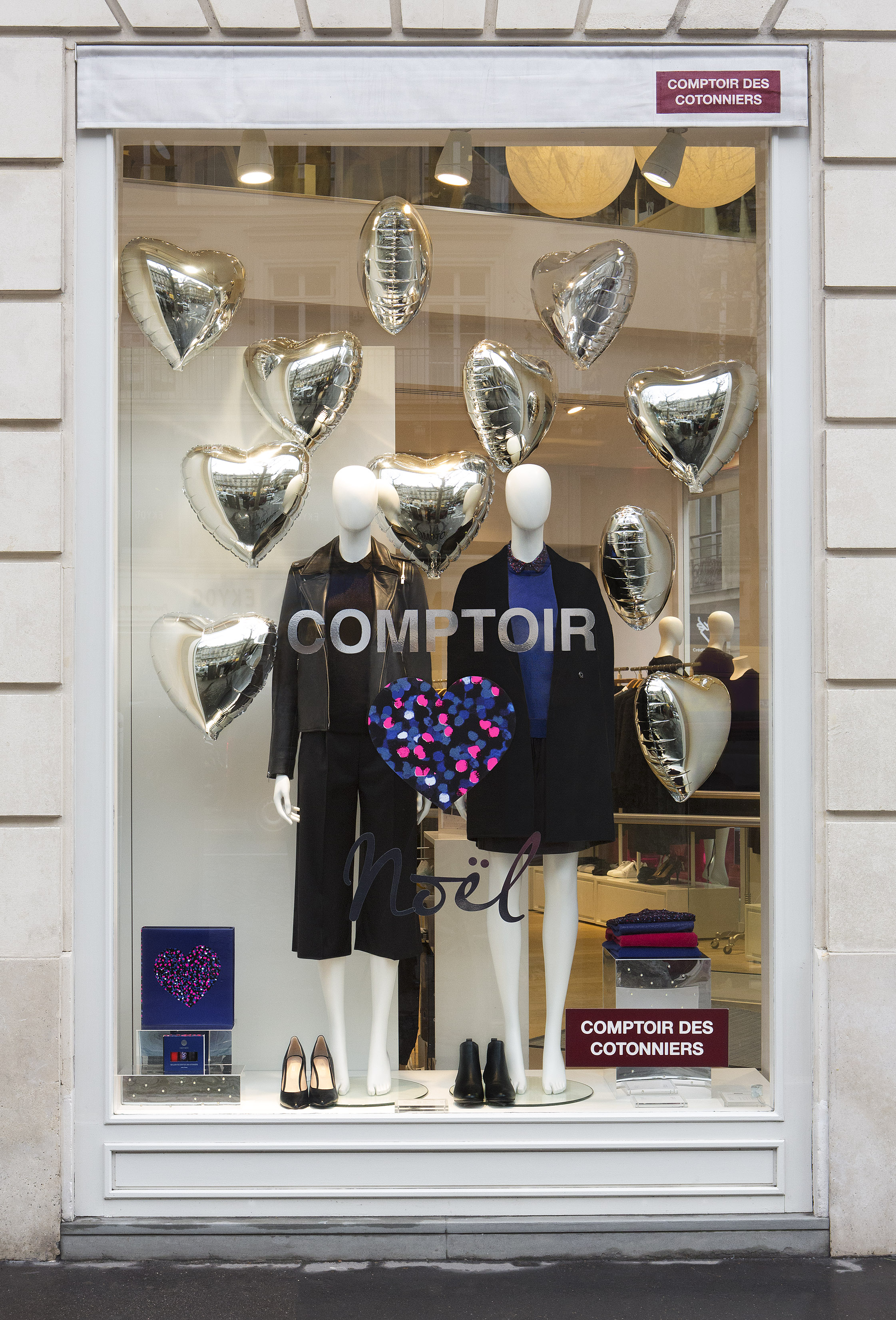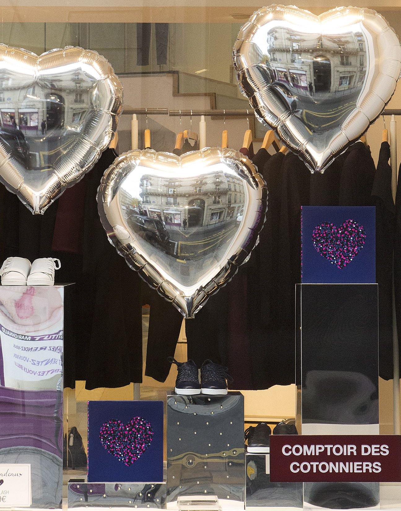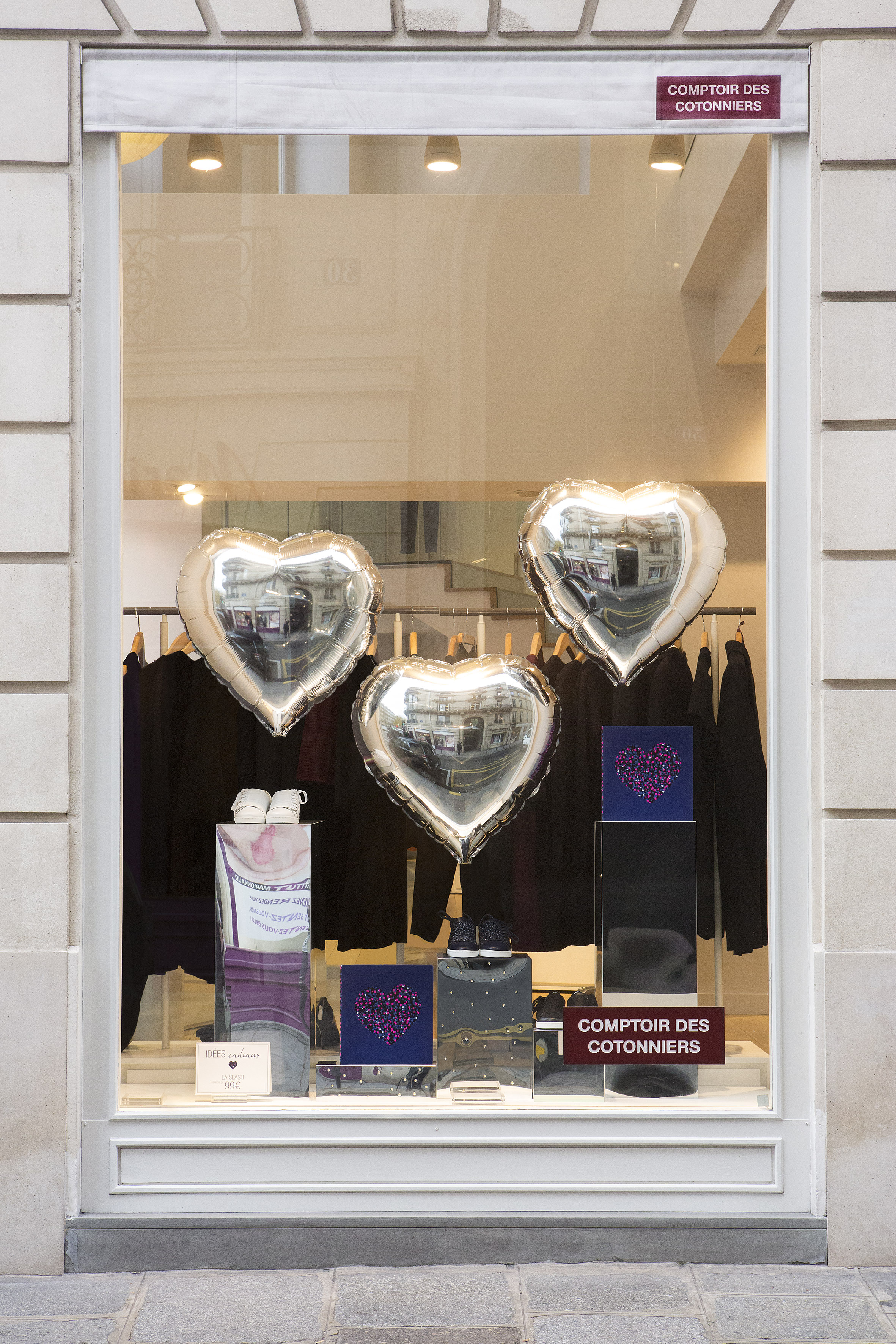 L’agence utilise le cœur pailleté présent sur le packaging comme fil conducteur de la scénographie. Elle dispose dans les vitrines des ballons Mylar argentés gonflés à l’hélium qui créent un motif festif et aérien, rappelant un semis de plumetis. Les accessoires de la collection sont mis en valeur sur des stèles en polystyrène miroir argenté, agrémentées de petites LED pour souligner l'éclat des produits. Au centre de la composition, le cœur pailleté iconique est mis en majesté au niveau du message marketing de la marque.