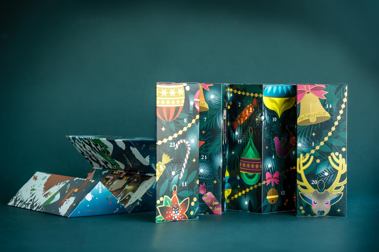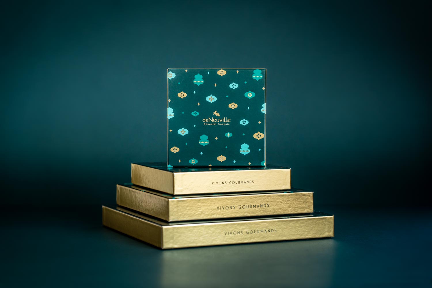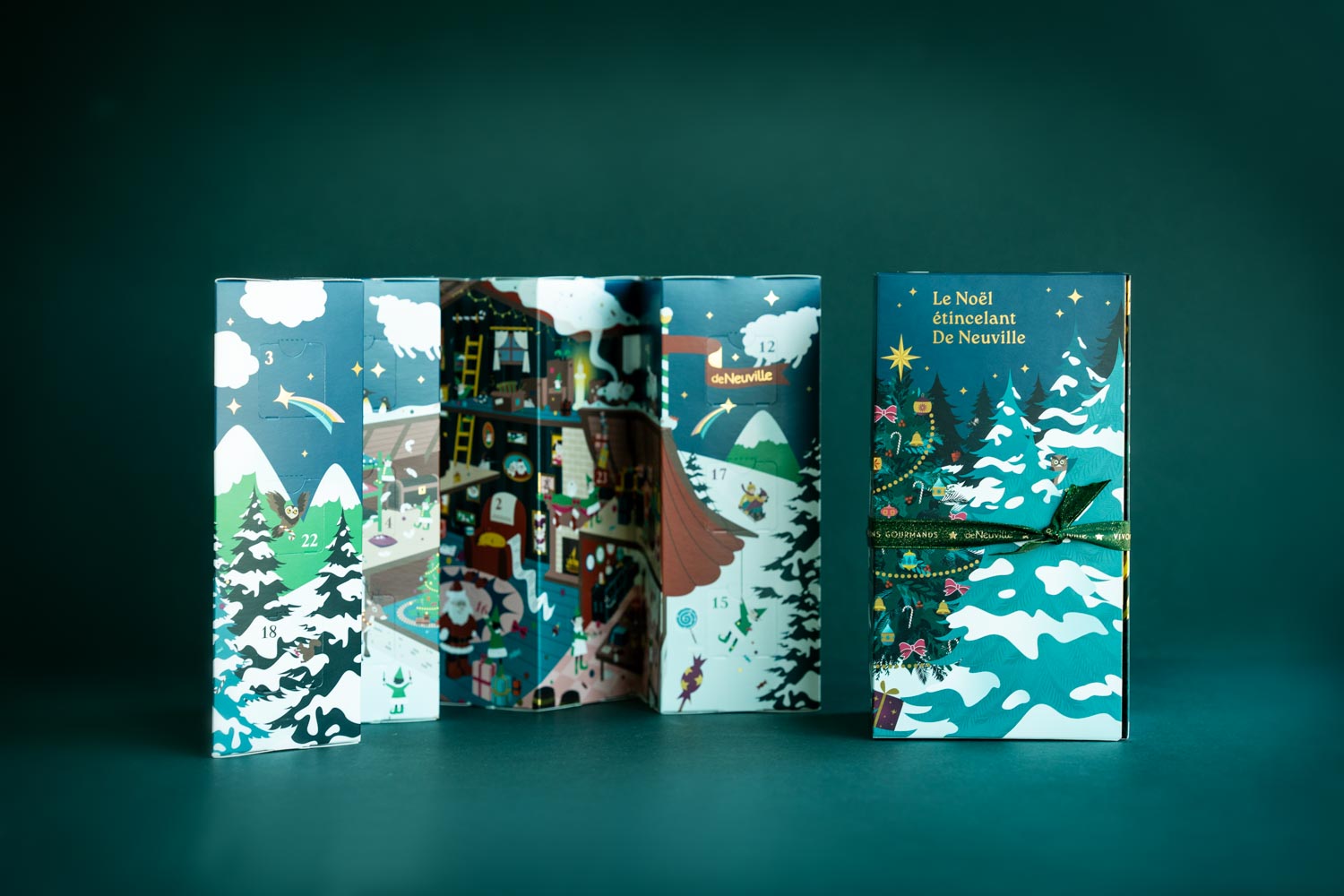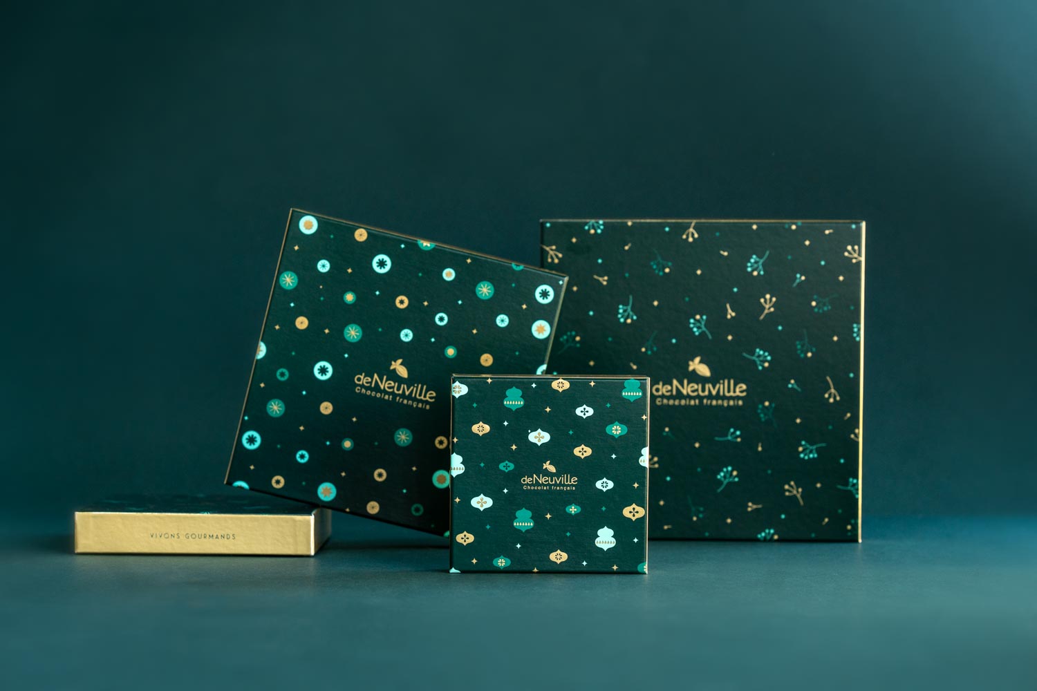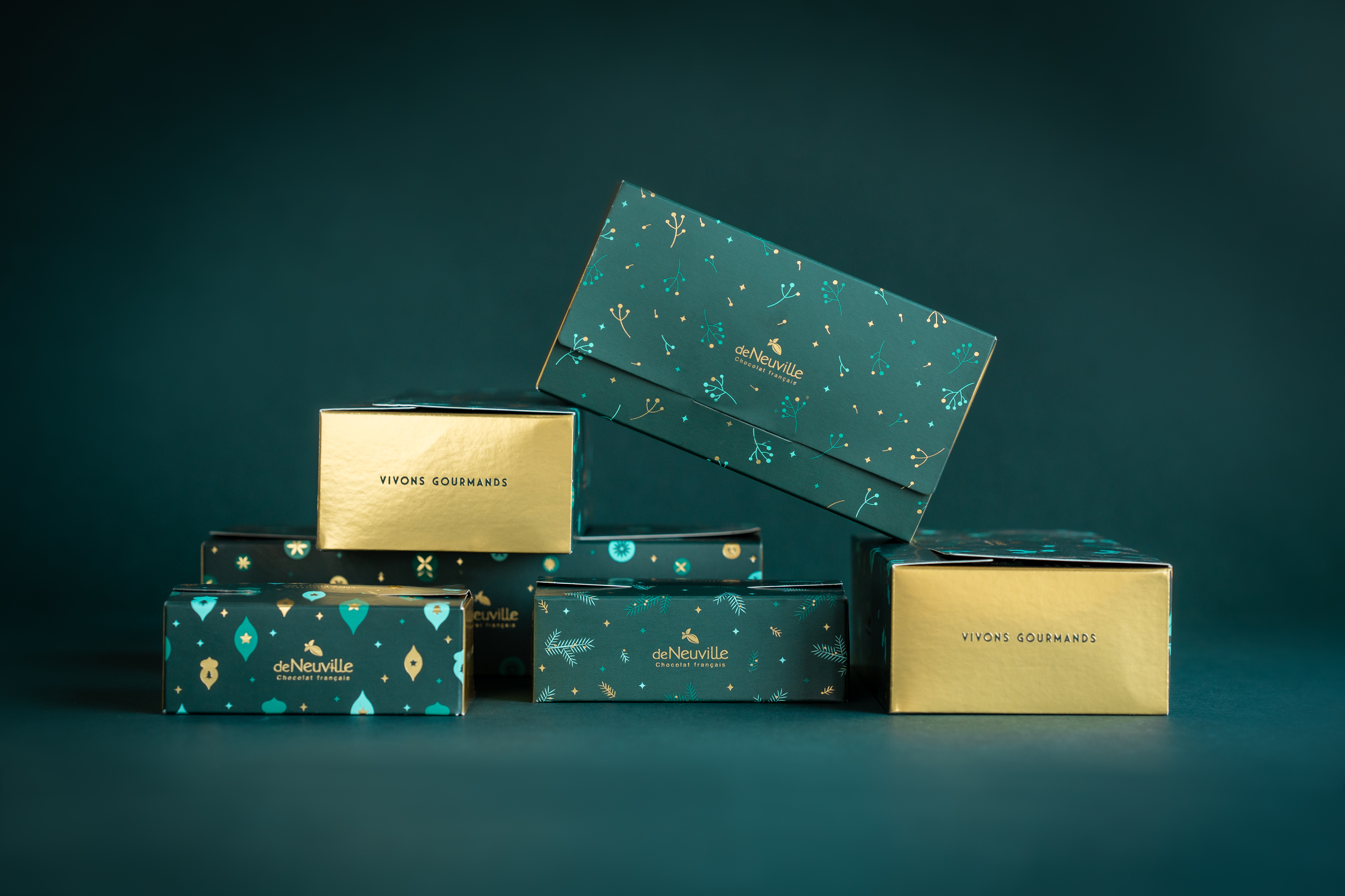 Pour la collection Noël 2024, de Neuville sollicite l’agence pour concevoir une identité packaging centrée sur la noblesse du végétal. L’univers chromatique s’articule autour d’un vert sapin profond, sublimé par un marquage à chaud doré sur les tranches et des déclinaisons de teintes de vert.
