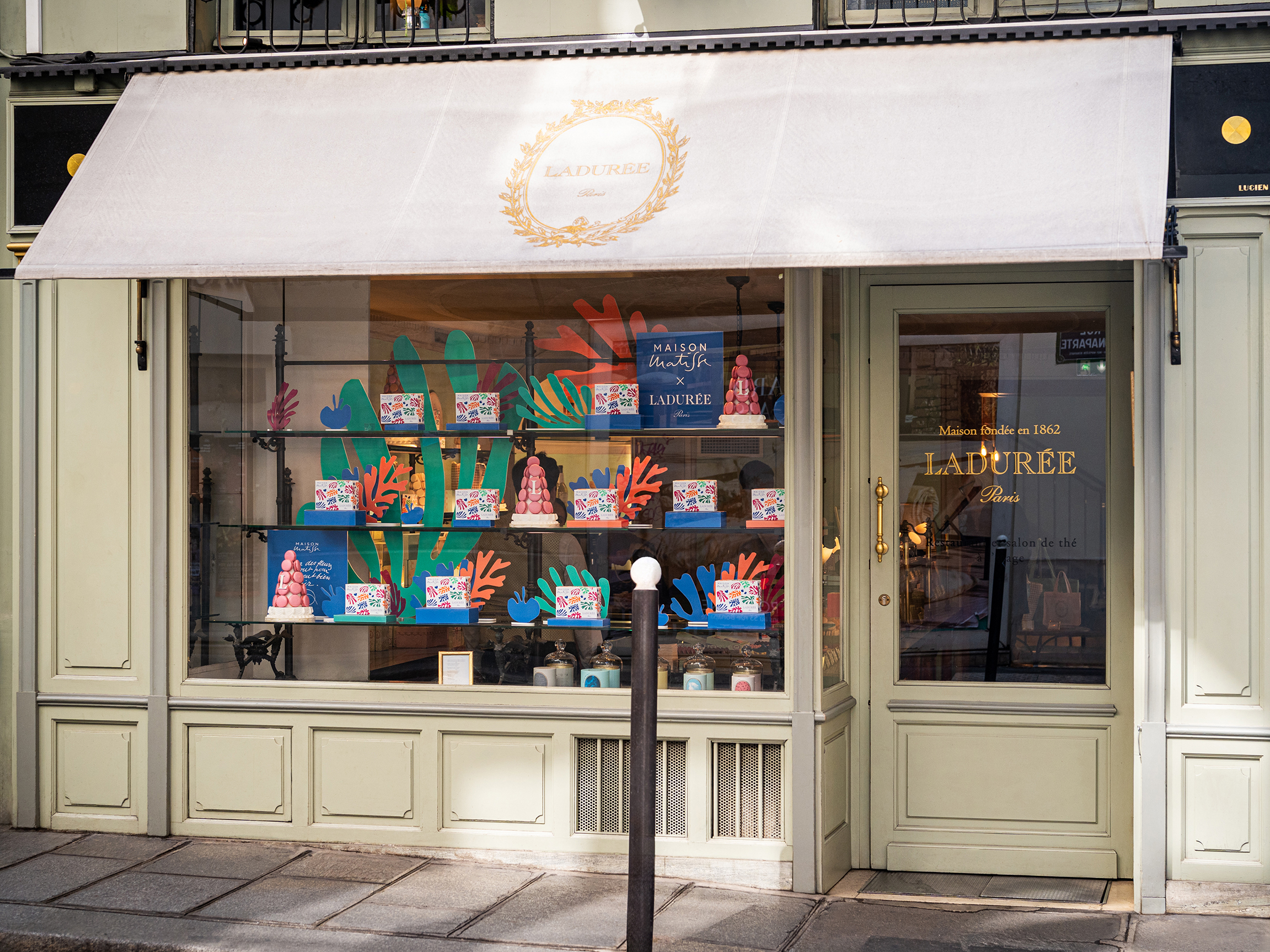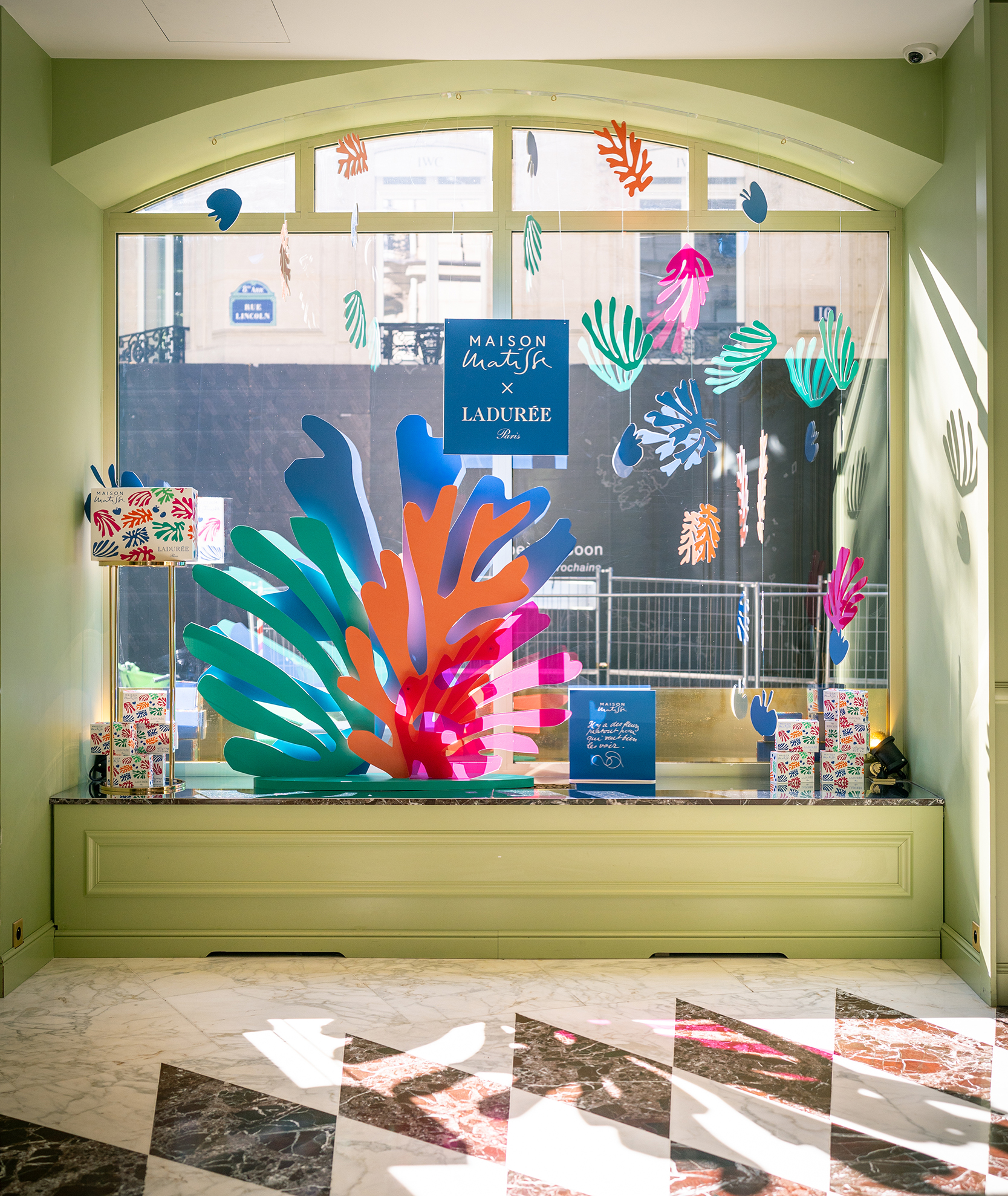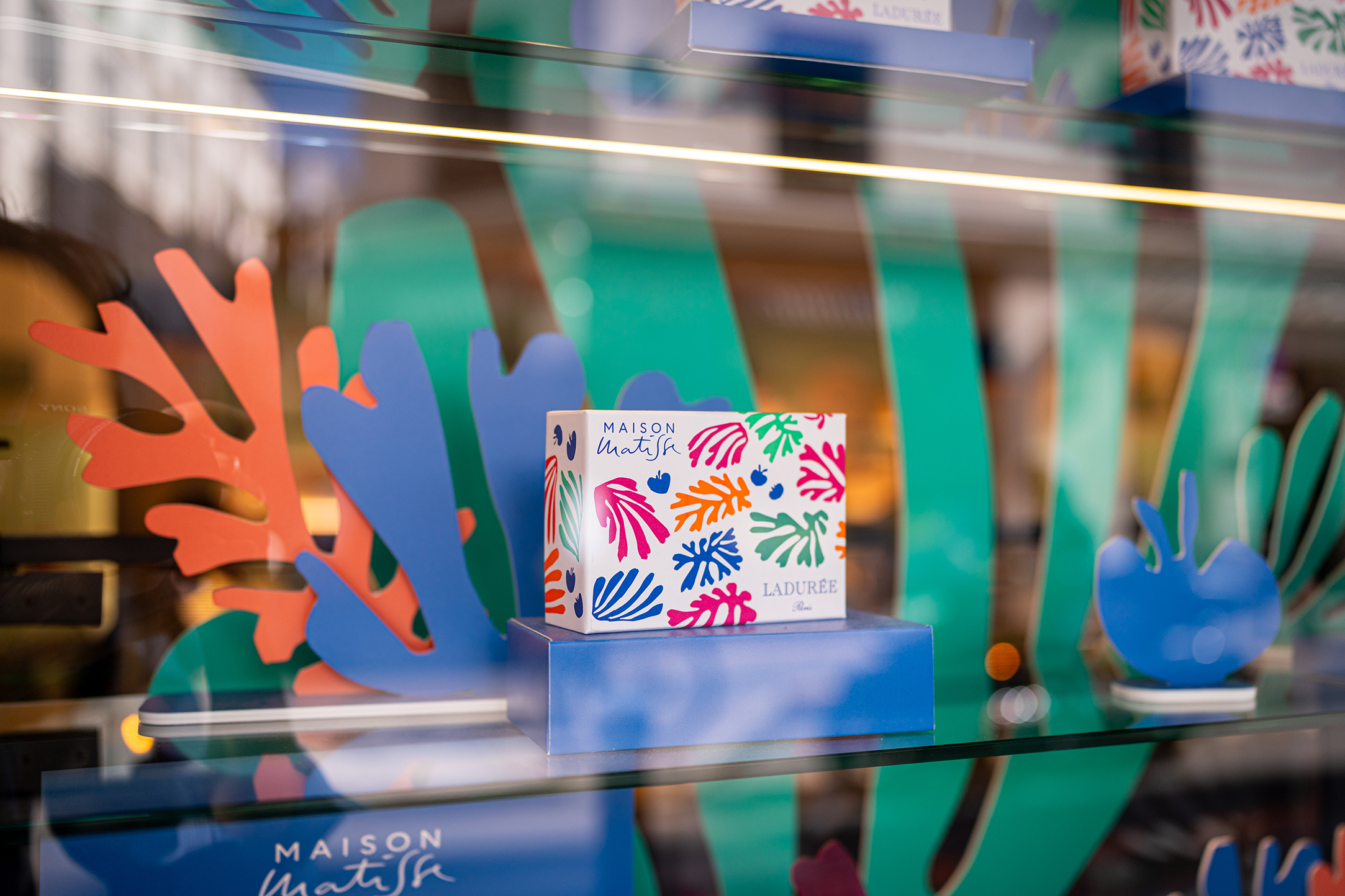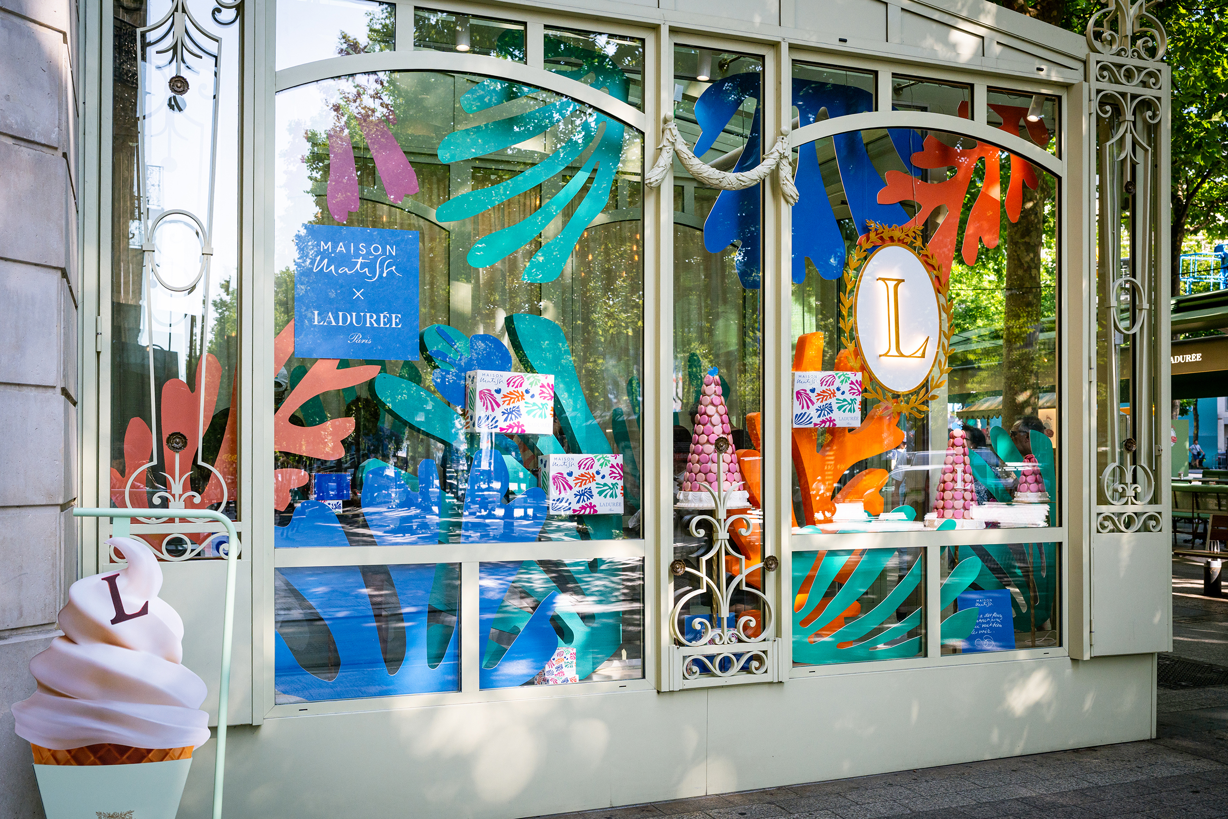 Le concept scénographique s’inspire directement des découpages colorés de Matisse et met en valeur les couleurs éclatantes de l’été, tout en restant fidèle à l’ADN de Ladurée.