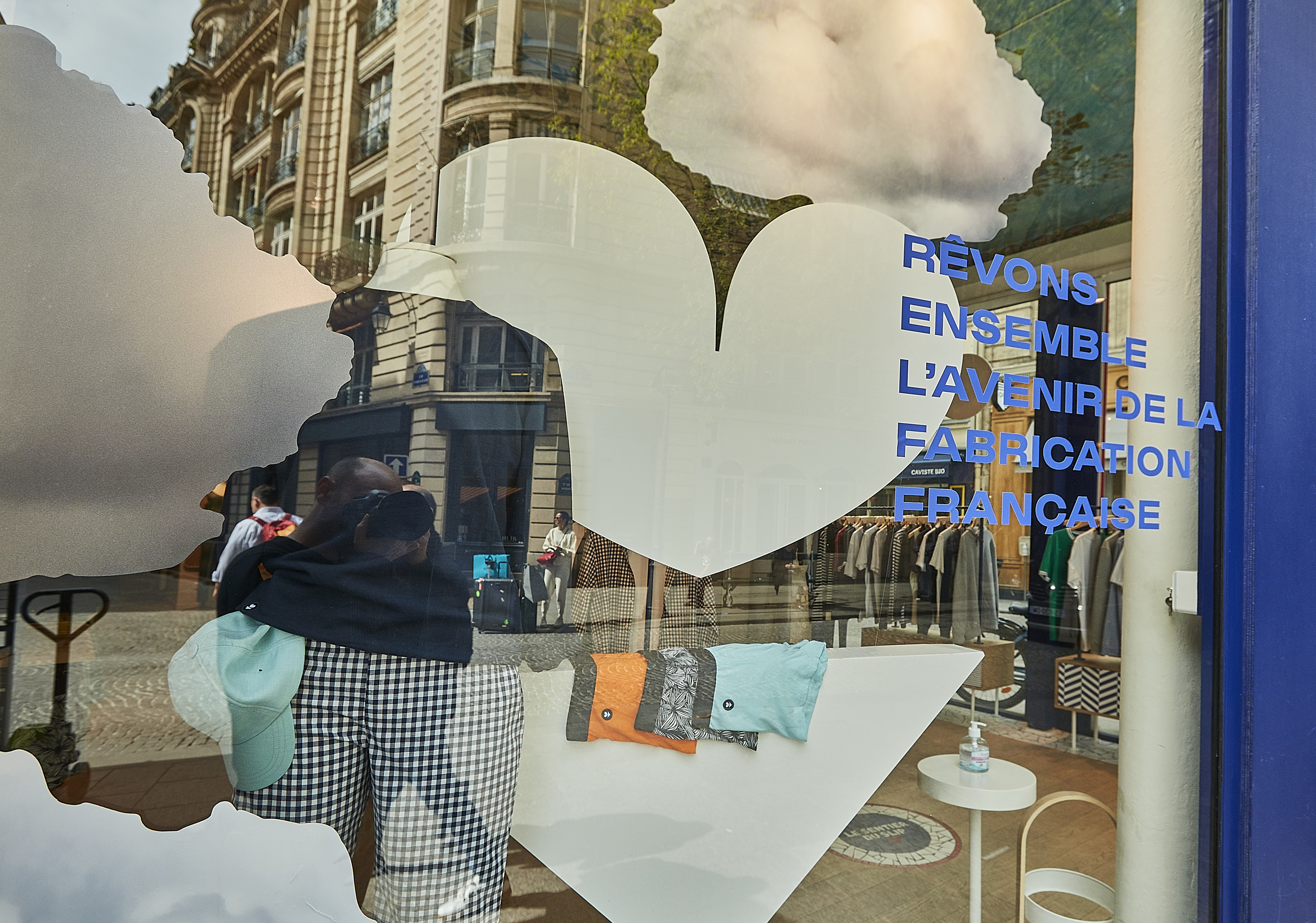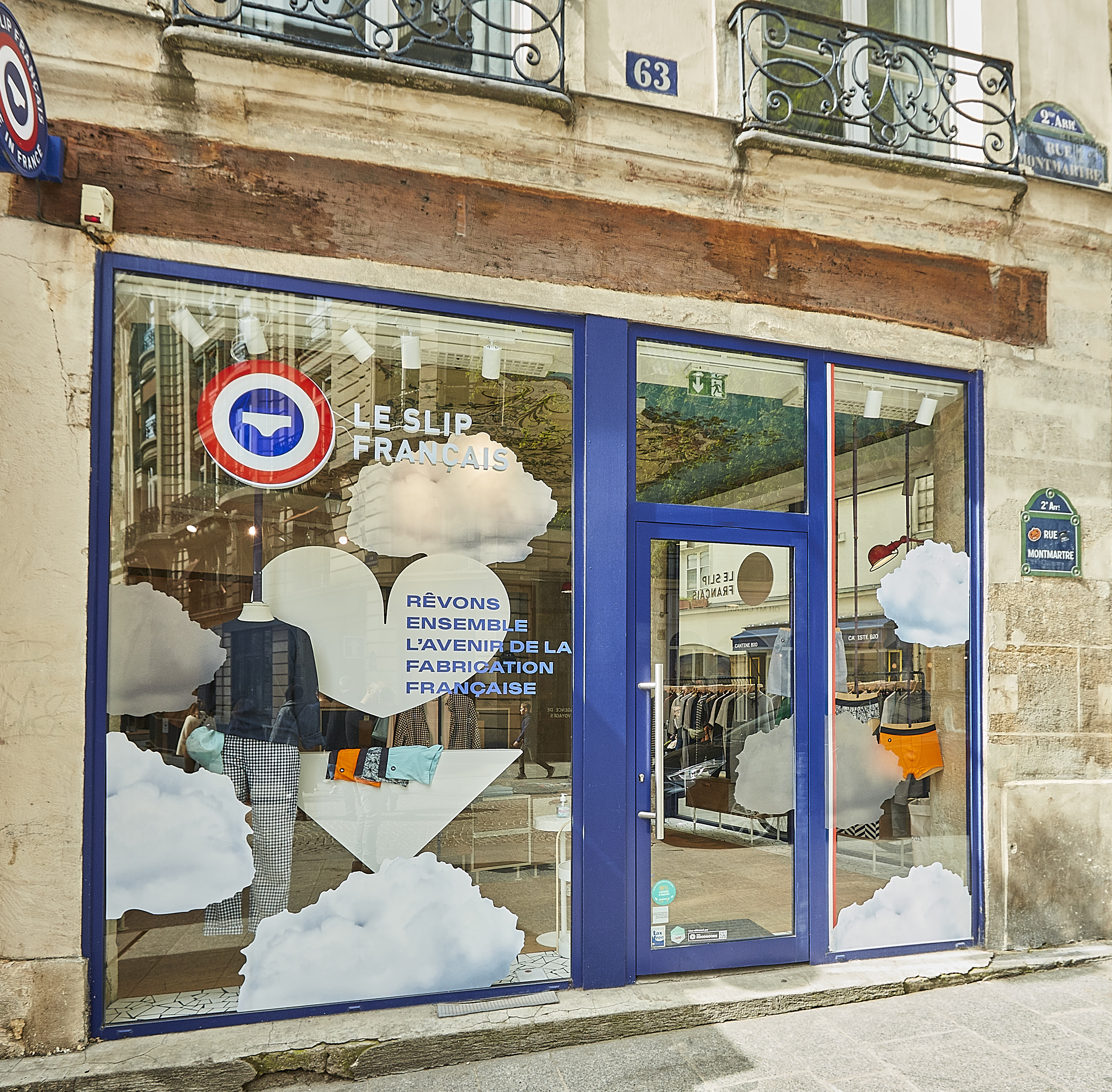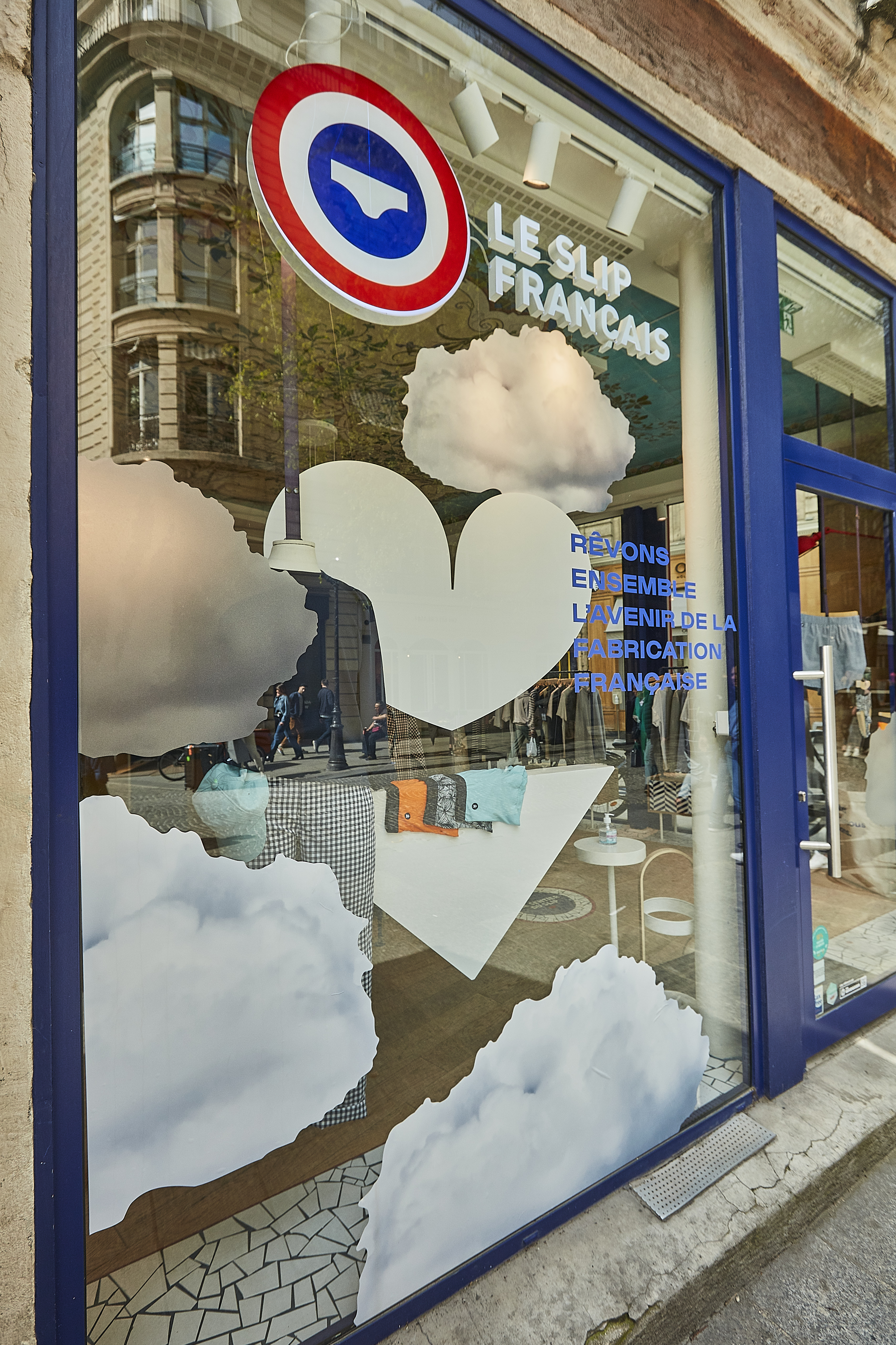 Le Slip Français inaugure sa nouvelle identité graphique à travers une campagne institutionnelle forte, initialement portée par un film publicitaire où les éléments du logo gravitent dans le ciel. L’agence se saisit de ces codes visuels pour transposer cet imaginaire en vitrine et assurer une continuité narrative entre l’image animée et le point de vente.