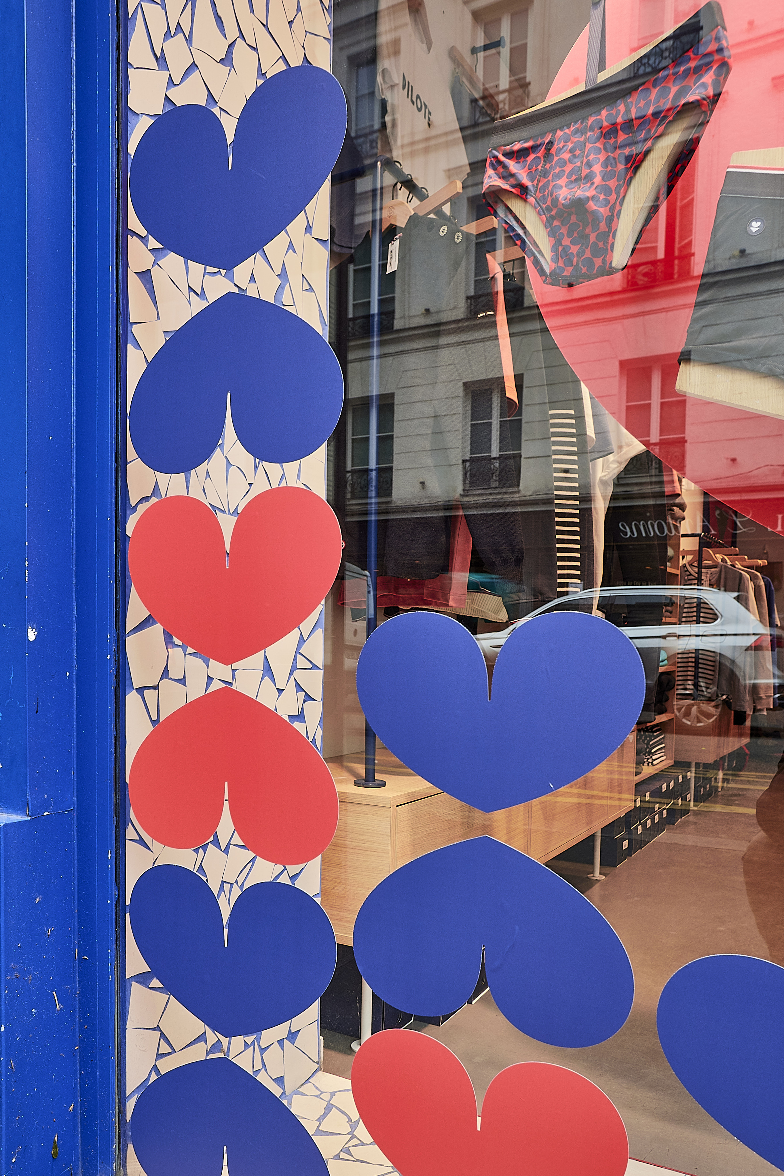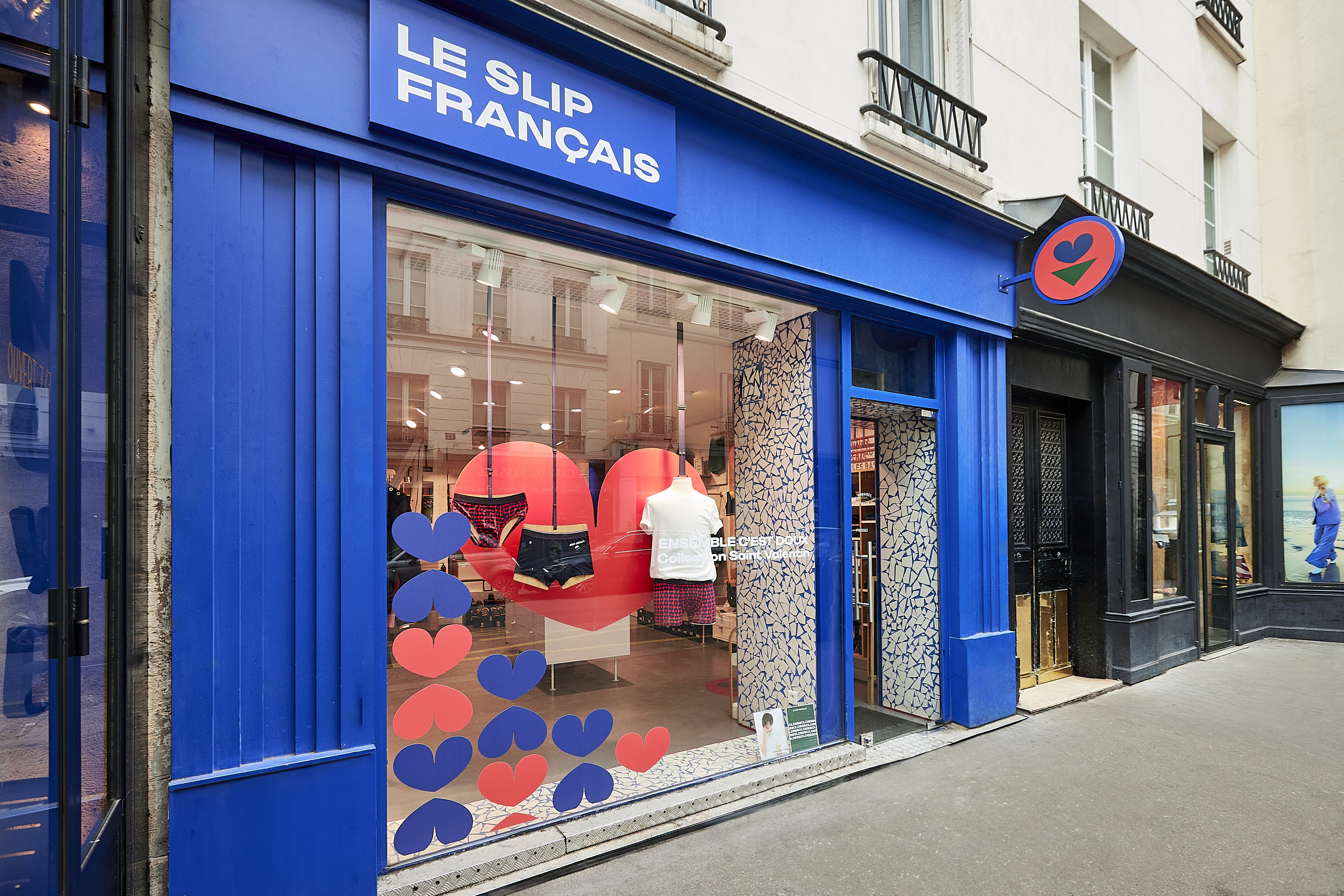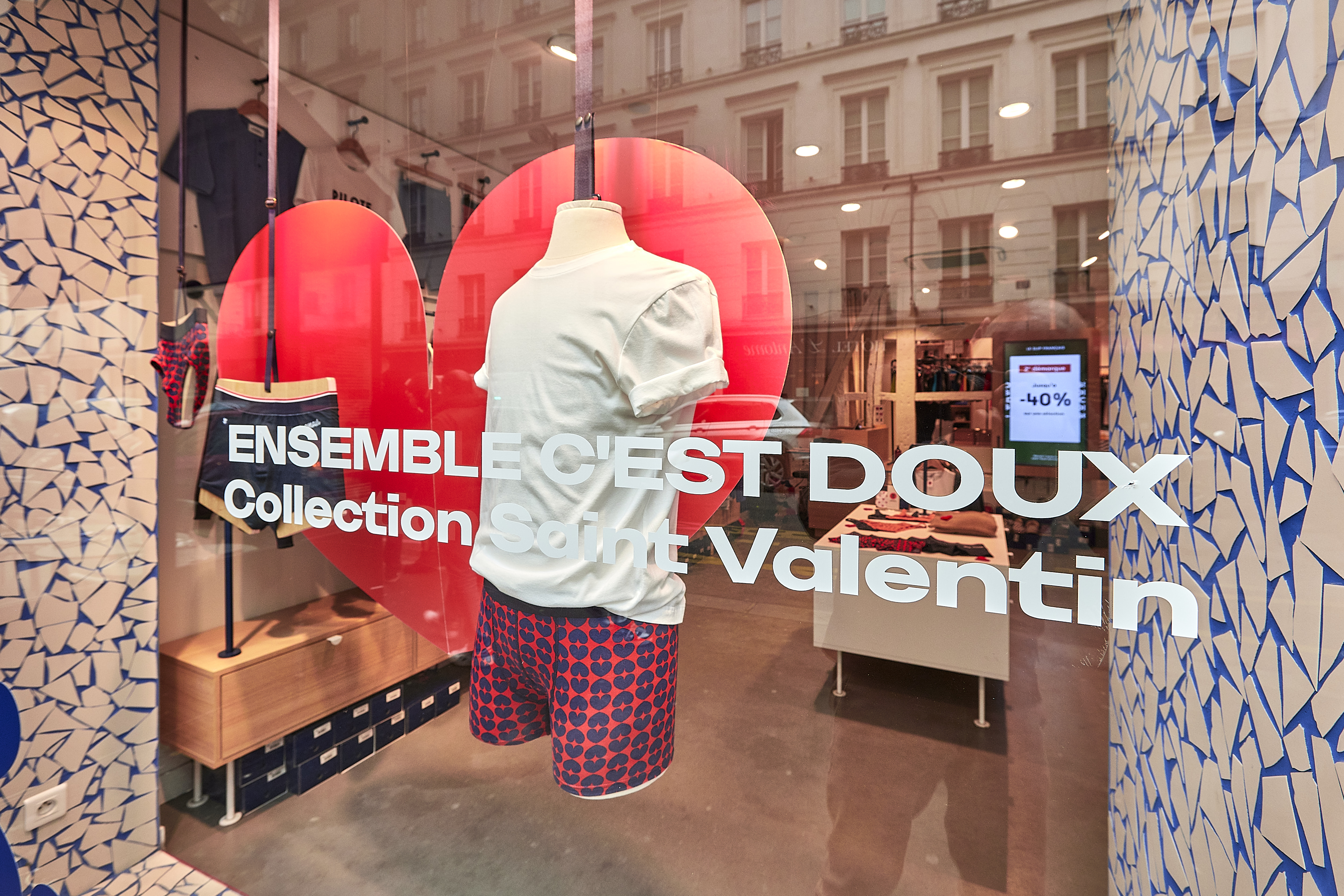 À l’occasion de la Saint-Valentin, Le Slip Français met à l’honneur son motif exclusif composé de cœurs rouges et bleu marine. L’agence s’approprie cet univers graphique pour concevoir une vitrine centrée sur un cœur rouge monumental placé en fond de décor.
