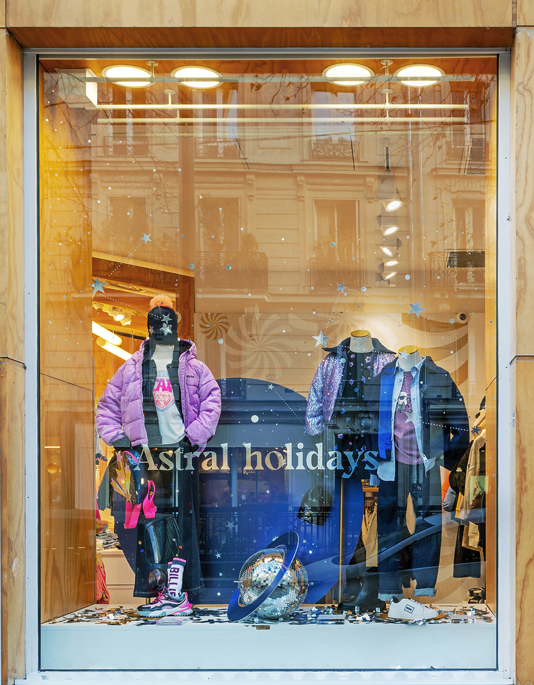 Kids Around, concept store multimarque de prêt-à-porter enfant premium, affirme son univers à travers une vitrine de Noël à forte personnalité, pensée pour capter le regard tout en restant fidèle à l’ADN de la marque. Le thème Astral Holidays s’impose comme une évidence.