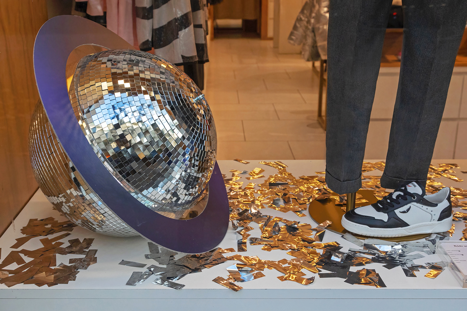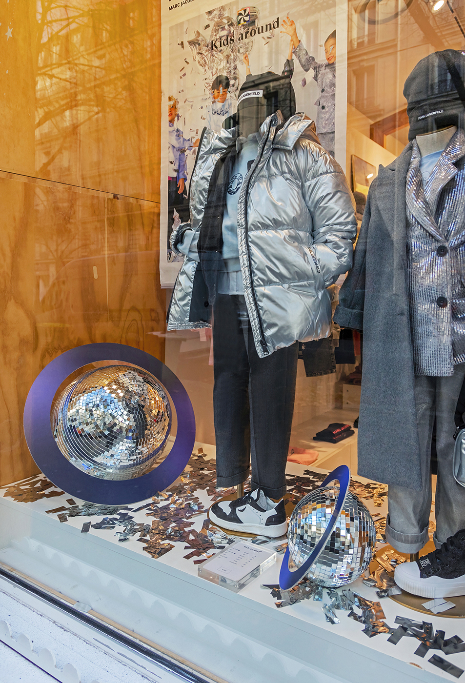 La scénographie immersive s’inspire du motif constellation présent dans l’univers Kids Around. Un fond dégradé bleu nuit accueille des constellations argentées, tandis que des boules à facettes deviennent des planètes grâce à des anneaux imprimés, reprenant le dégradé du fond. Ce décor graphique, festif et lumineux, est conçu pour émerger dans un contexte retail particulièrement dense et créer une expérience différenciante, mémorable et immédiatement identifiable.