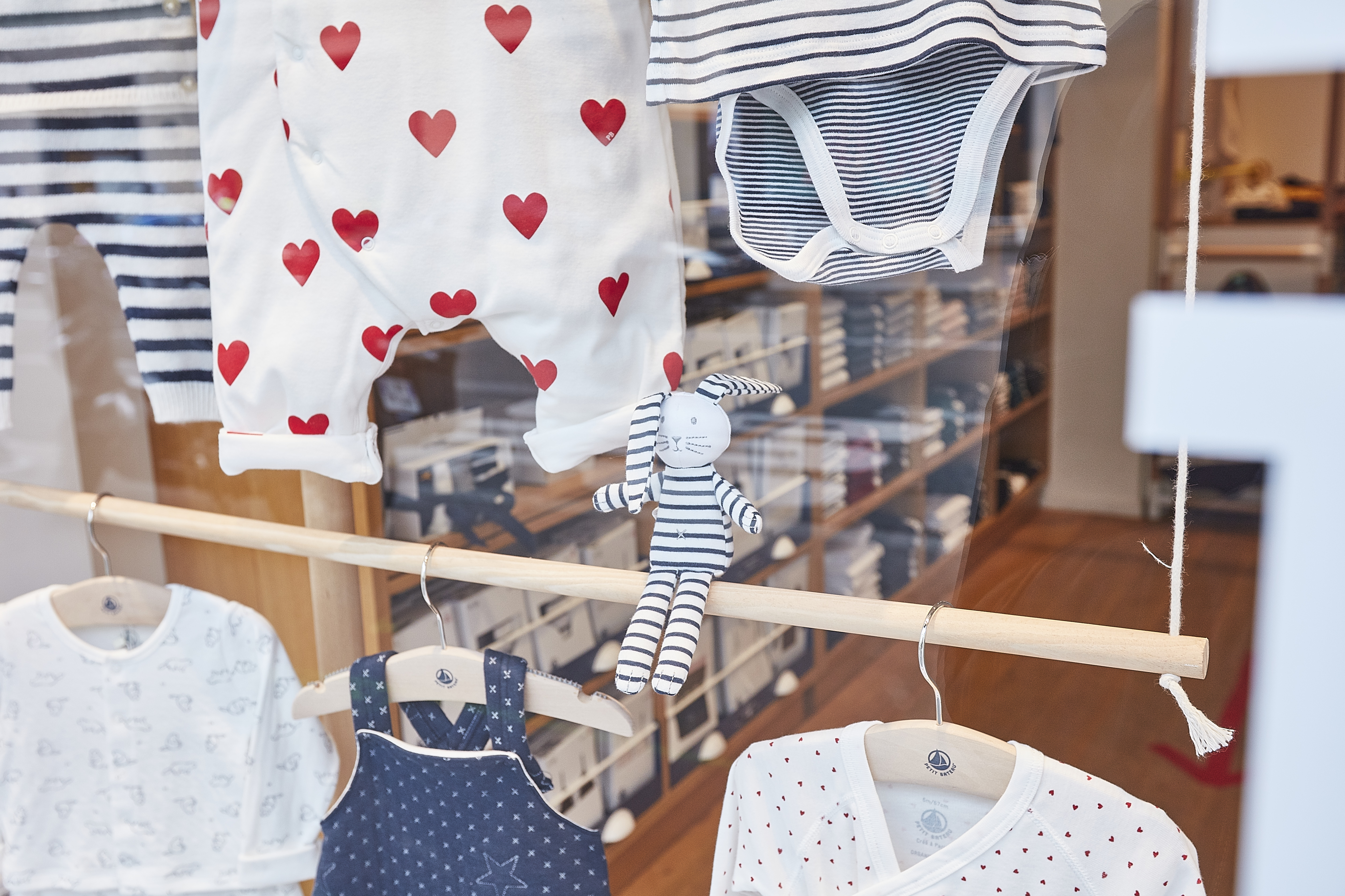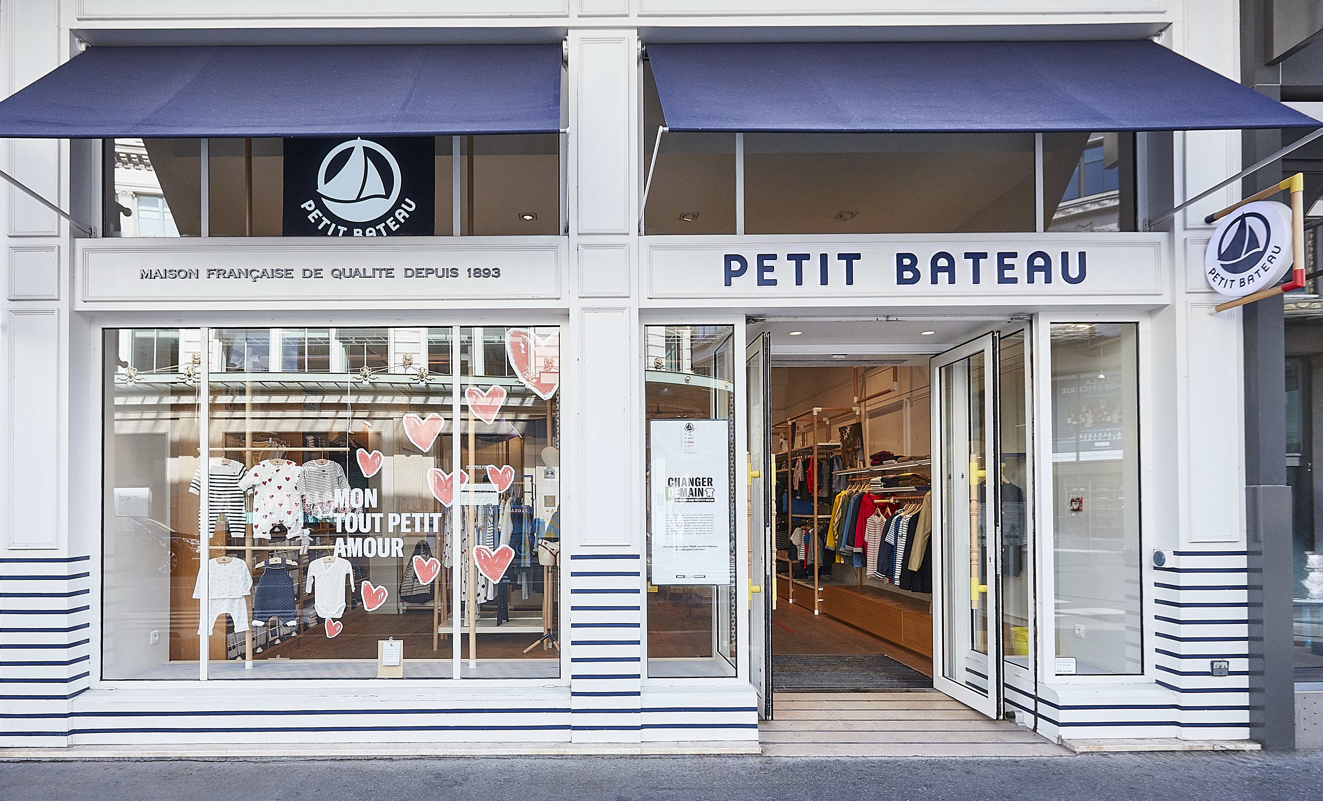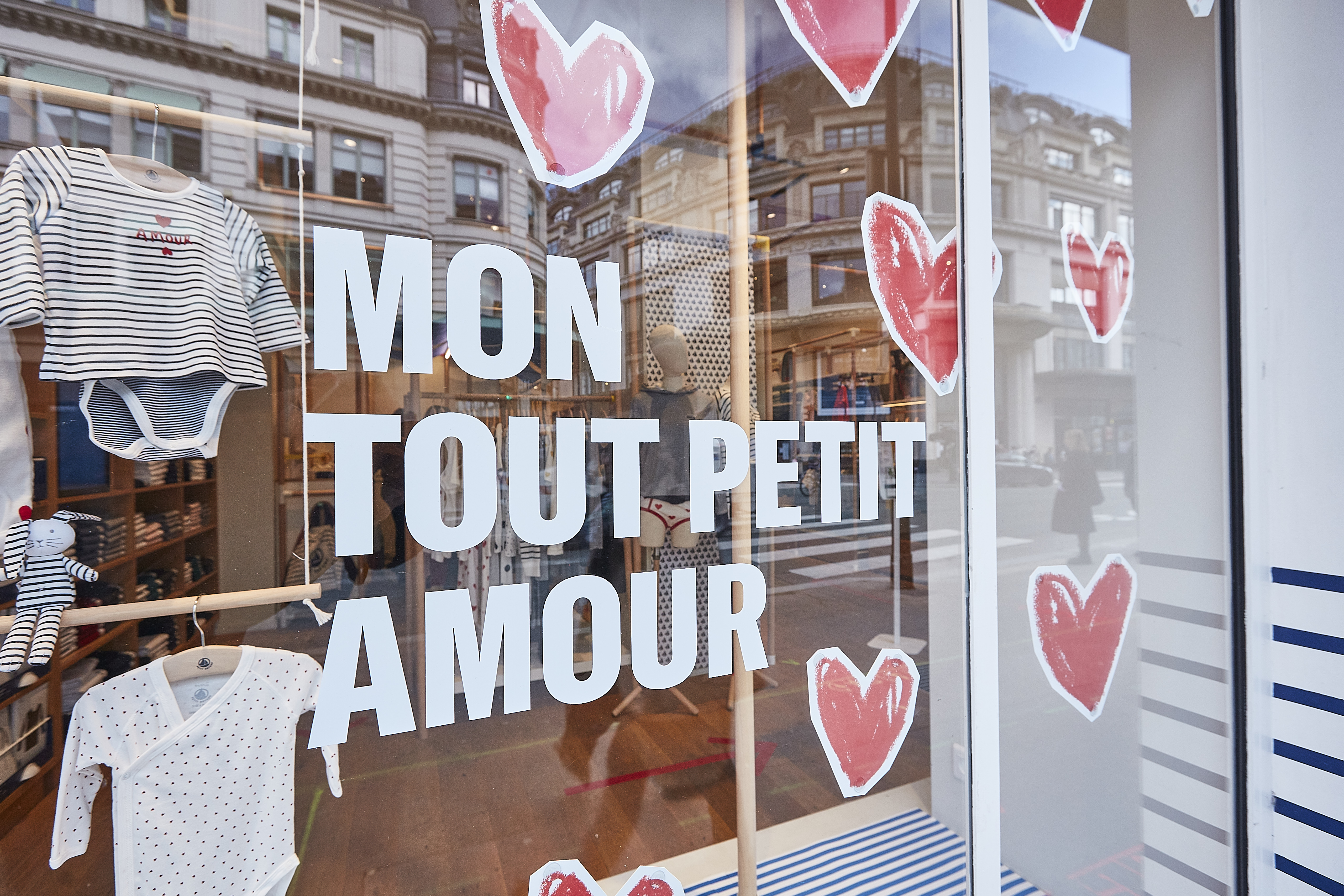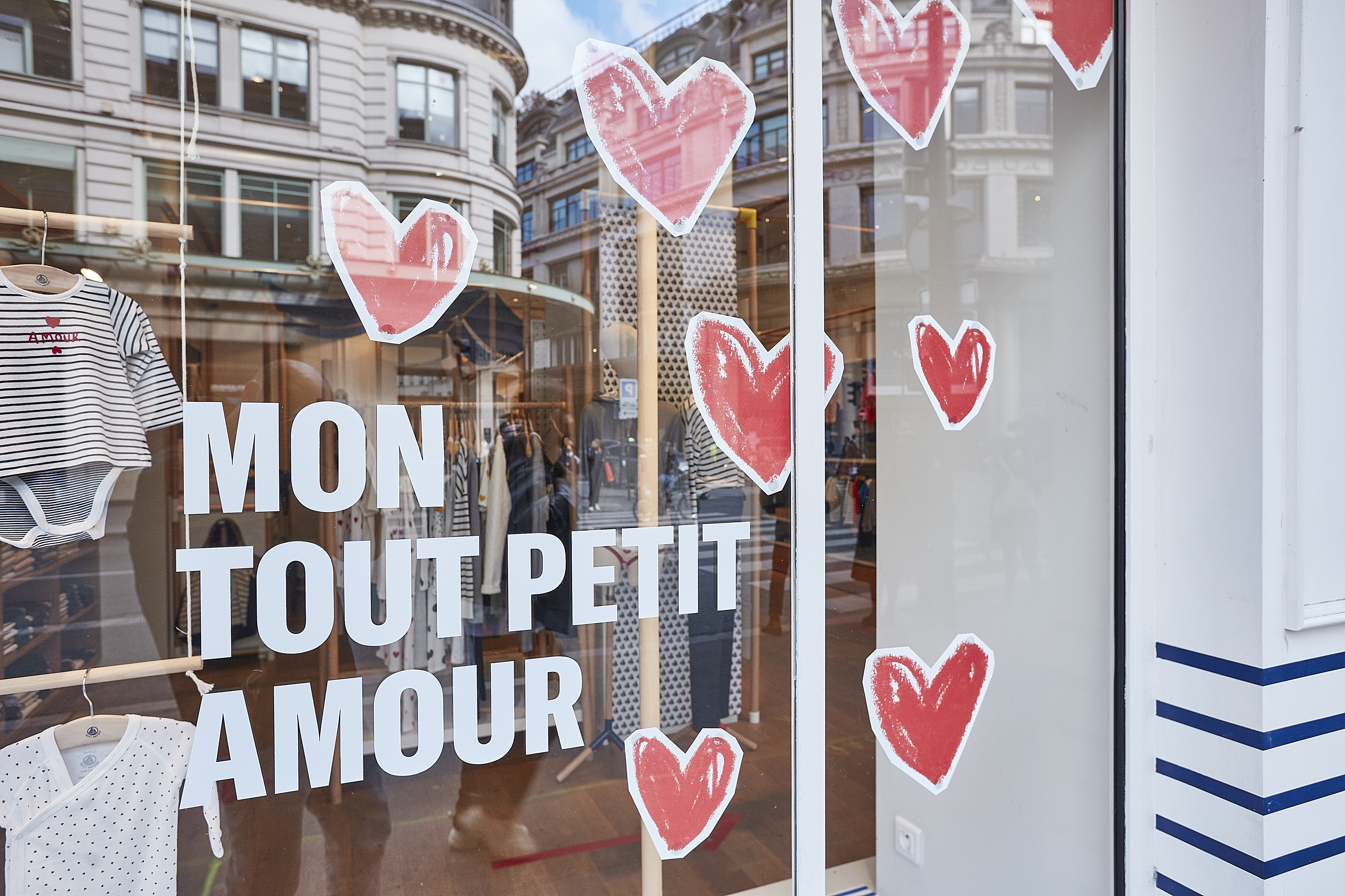 Chaque année, Petit Bateau met en avant sa collection Bébé, reconnue pour son motif iconique : le plumetis de petits cœurs rouges. Pour cette vitrine, nous nous inspirons de ce motif pour créer, à la craie, une envolée de cœurs qui habille la vitrine avec légèreté.