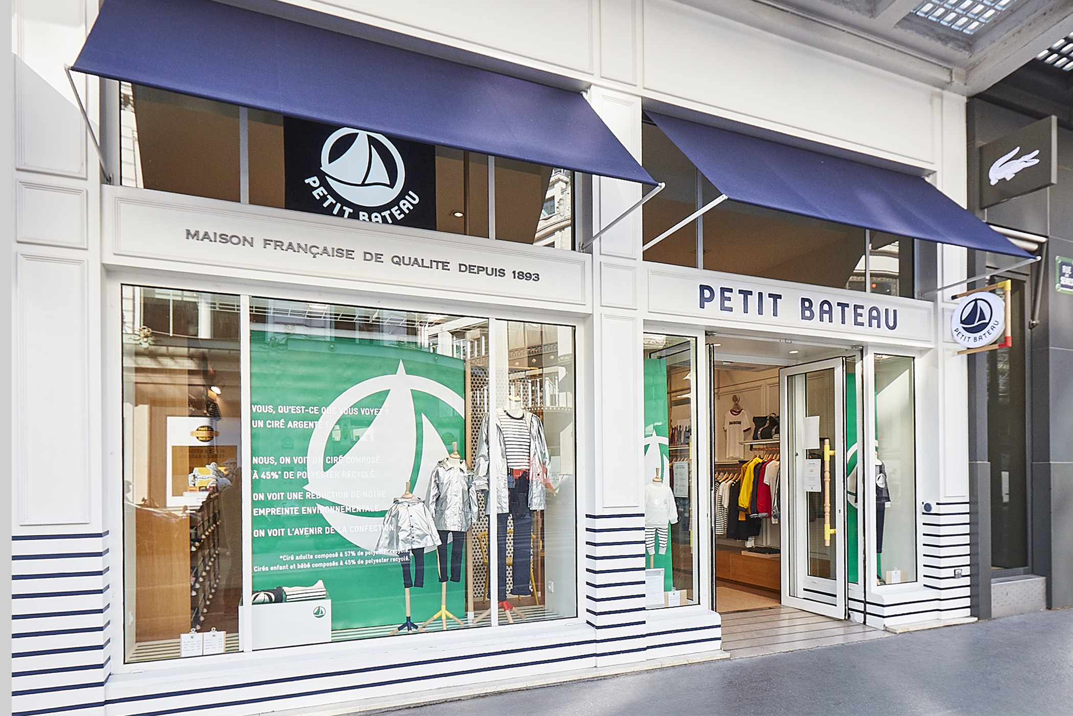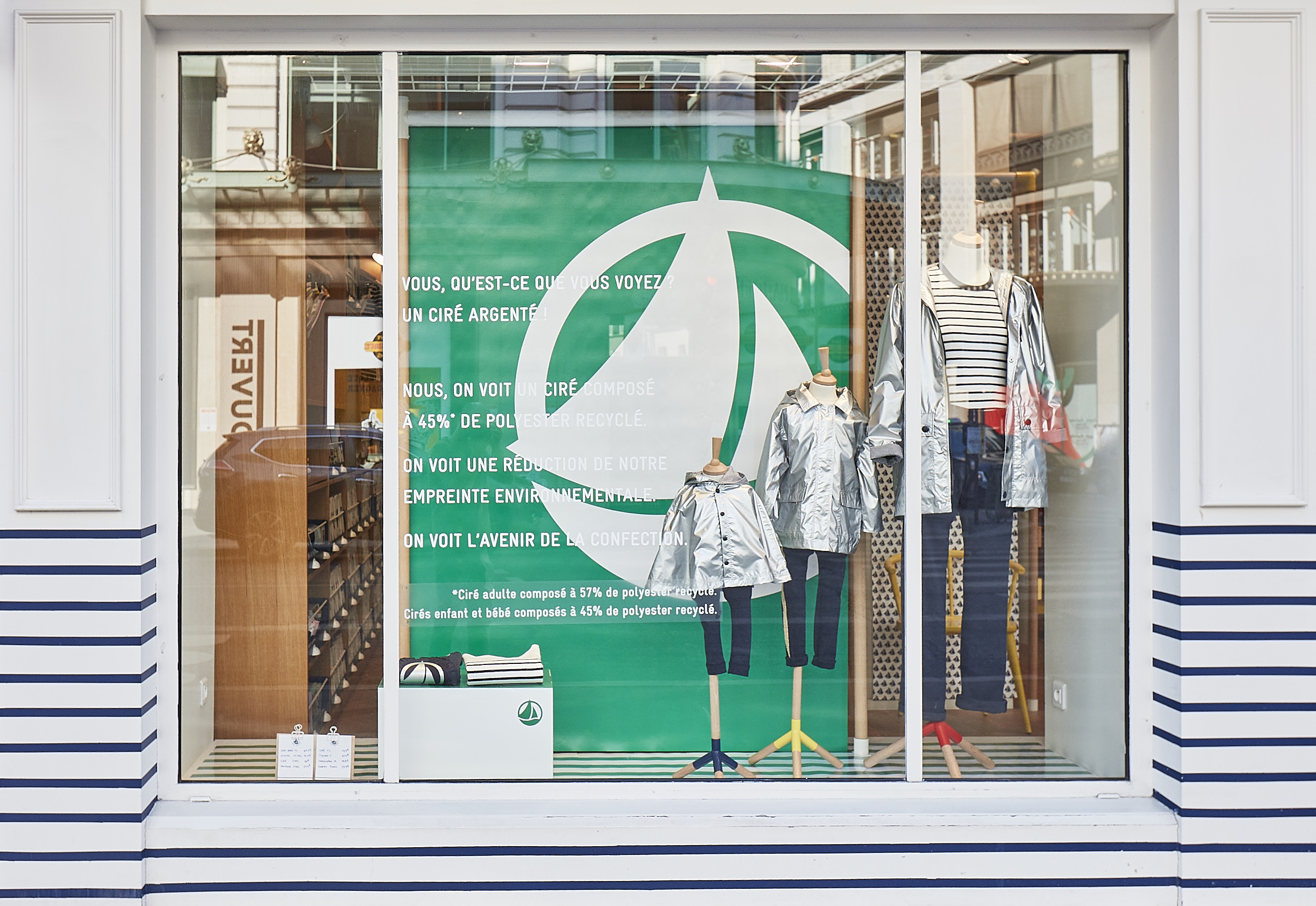 A travers cette vitrine, Petit Bateau met en avant une collection de cirés argentés, intégrant 45 % de polyester recyclé afin de réduire l’impact environnemental. Cette ligne illustre la vision de la marque pour un futur plus responsable de la confection.
