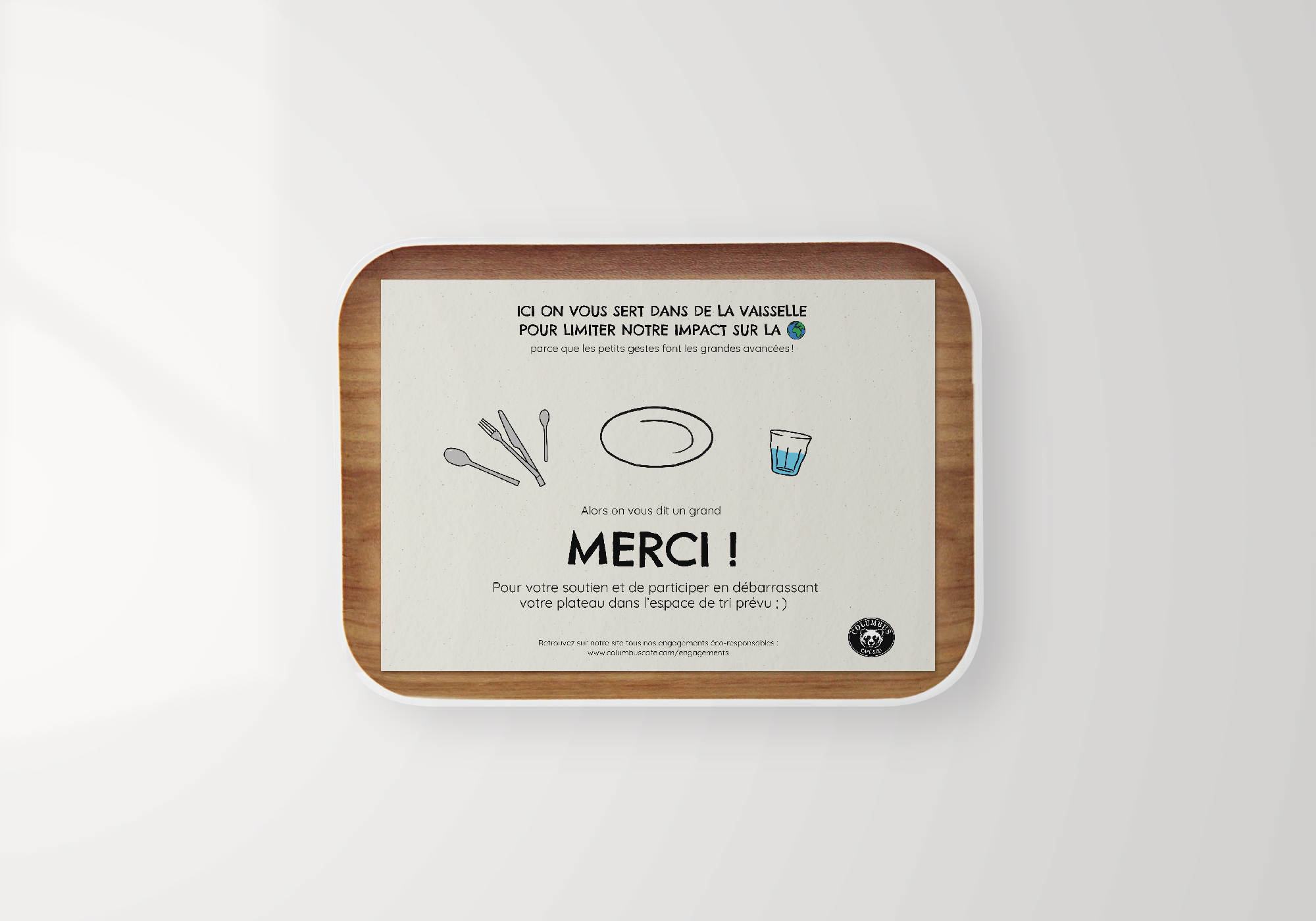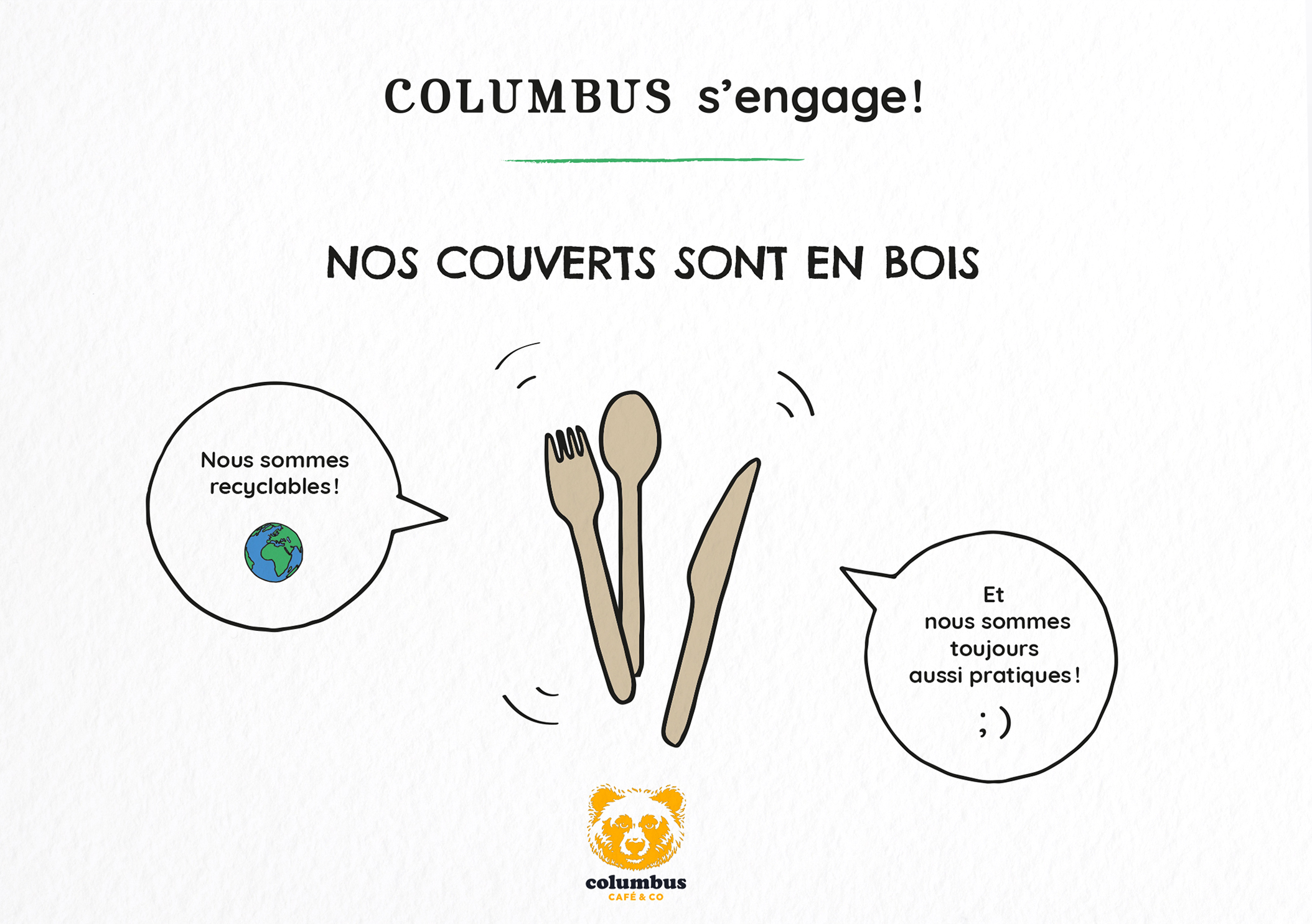 Le concept visuel repose sur un traité illustratif manuscrit et spontané, réalisé sur mesure. Ces dessins vectoriels, aux lignes simples et vivantes, mettent en scène les nouveaux usages : vaisselle durable, couverts en bois ou contenants réutilisables. Ce choix graphique humanise le discours institutionnel et favorise l’adhésion des clients aux gestes du quotidien, comme le tri des plateaux ou l'utilisation de mugs consignés.