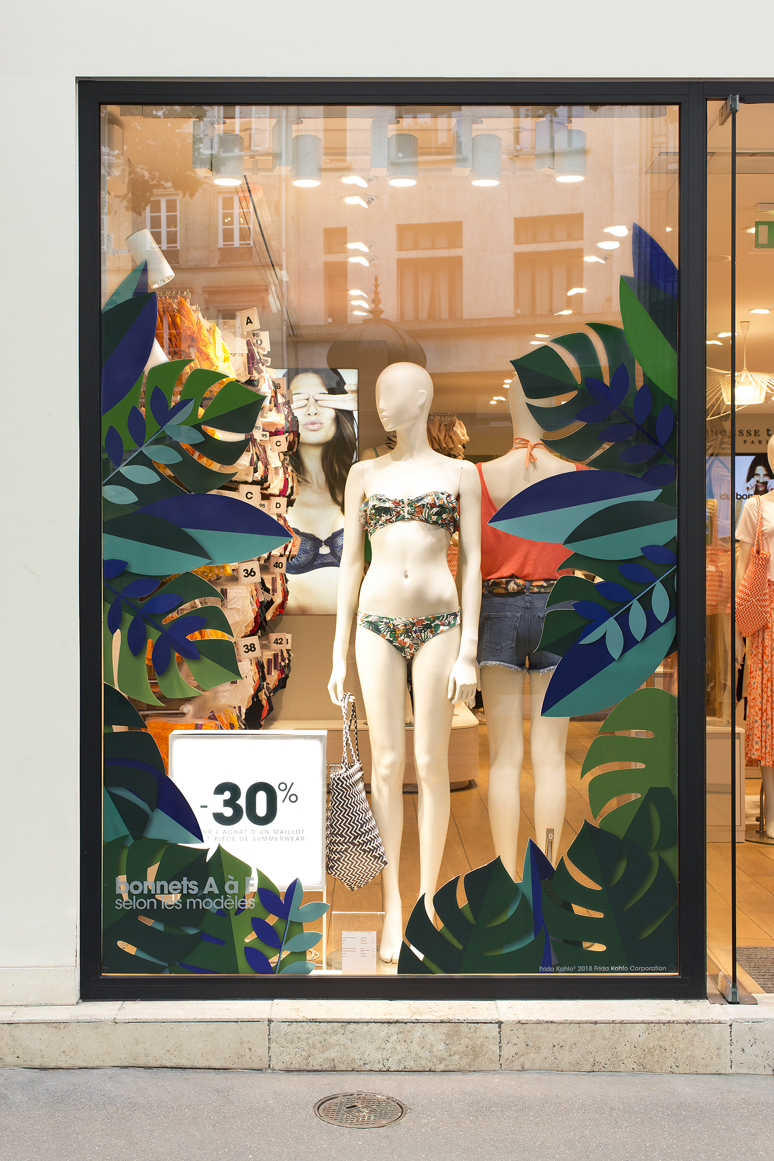 Pour le lancement de la collection balnéaire « Exotica », l’agence imagine pour Princesse Tam-Tam une vitrine immersive qui célèbre l’esthétique tropicale de la gamme de maillots de bain de la marque. La scénographie repose sur une accumulation de feuilles exotiques aux illustrations dessinées sur mesure, créant un écrin végétal luxuriant autour des mannequins.